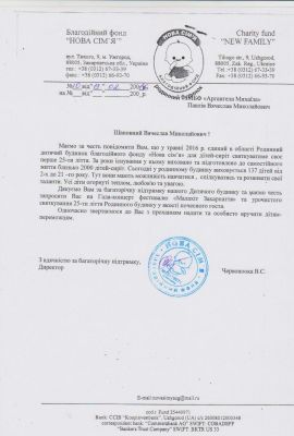 Семейный детский дом благотворительного фонда «Новая семья», благодарит Международный благотворительный фонд «Архангела Михаила» и лично Павлива Вячеслава Николаевича за многолетнюю поддержку Детского дома.